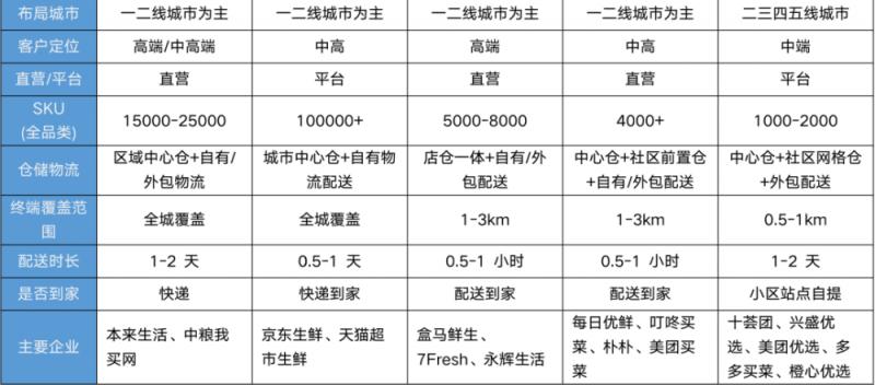 從生鮮電商模式發展來看,截至目前主要出現了五種模式,包括傳統垂直電商、傳統平臺電商、店倉一體(含超市到家)、前置倉、社區團購等。按照倉儲物流和配送方式的不同,前兩類屬于傳統生鮮電商,以區域/城市中心倉+物流快遞實現目標城市全覆蓋;后三類主打社區生鮮電商,以社區店/倉+市內配送實現目標社區的全覆蓋,是目前較為主流的模式。