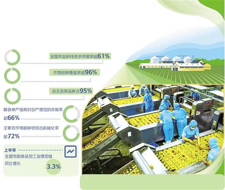 農(nóng)業(yè)農(nóng)村部最新數(shù)據(jù)顯示,全國(guó)農(nóng)業(yè)科技進(jìn)步貢獻(xiàn)率超過(guò)61%,作物良種覆蓋率超過(guò)96%,自主選育品種占95%,糧食單產(chǎn)提高對(duì)總產(chǎn)增加的貢獻(xiàn)率超過(guò)66%,主要農(nóng)作物耕種收綜合機(jī)械化率超過(guò)72%,農(nóng)業(yè)科技已成為引領(lǐng)農(nóng)業(yè)農(nóng)村現(xiàn)代化的強(qiáng)勁引擎。10年間,我國(guó)農(nóng)業(yè)科技水平已從世界第二方陣邁入第一方陣,處于發(fā)展中國(guó)家領(lǐng)先地位。