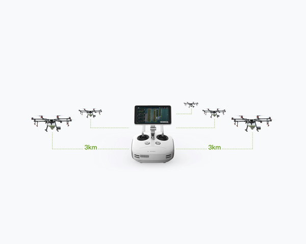 MG-1P 系列支持一控多機(jī),一個遙控器最多可控制 5 架 MG-1P 系列植保機(jī)同時作業(yè)。新一代智能遙控器控制距離提升至 3,000 米,支持同等距離高清圖傳。同時飛機(jī)之間相互廣播飛行狀態(tài),主動規(guī)避,保證飛行安全。