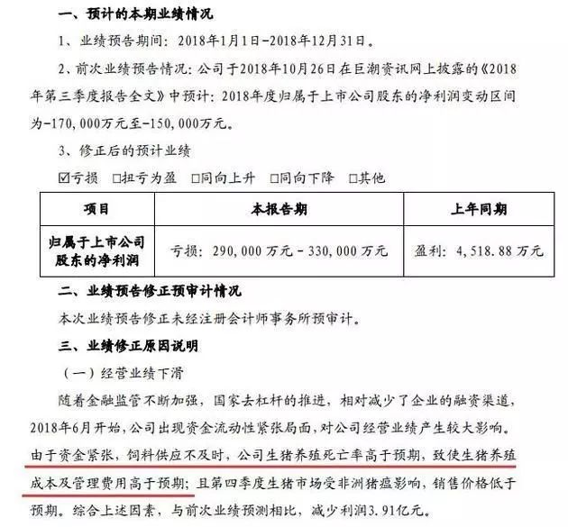 “養(yǎng)豬第一股”雛鷹農(nóng)牧,2019年1月30日晚間披露業(yè)績(jī)預(yù)告修正公告,修正后預(yù)計(jì)虧損29億元-33億元。2018年6月開(kāi)始,公司出現(xiàn)資金流動(dòng)性緊張局面,由于資金緊張,飼料供應(yīng)不及時(shí),公司生豬養(yǎng)殖死亡率高于預(yù)期。