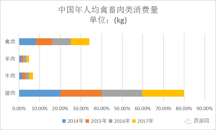 中國禽畜肉類人均年消費量(kg)