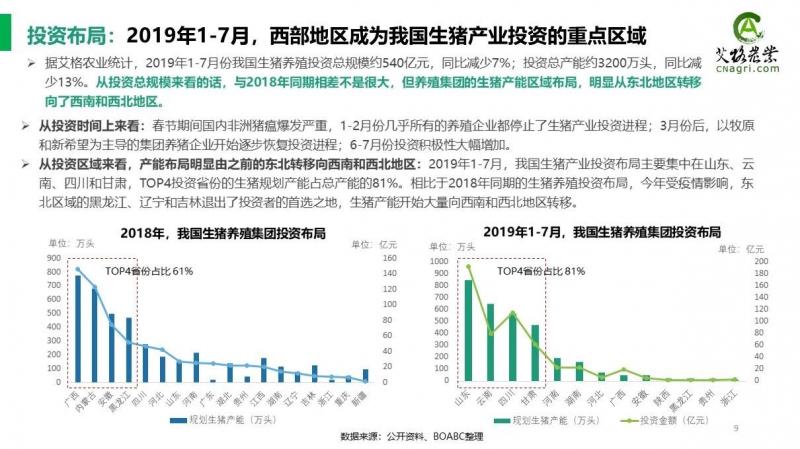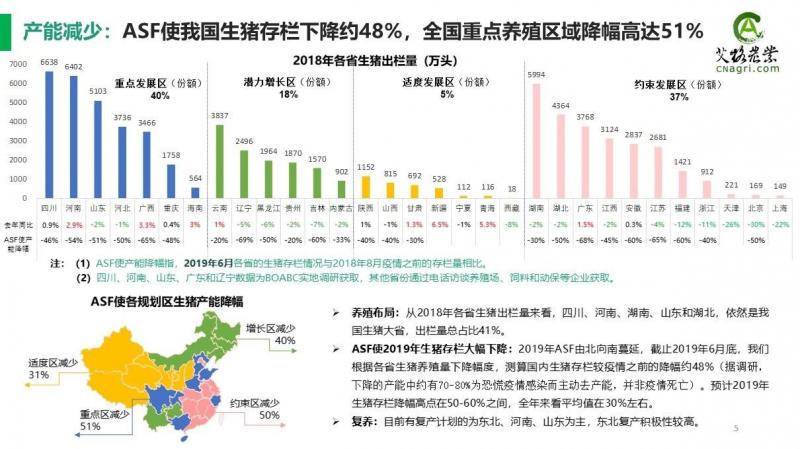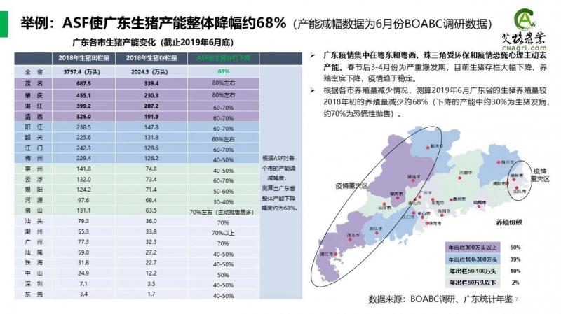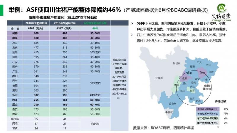 今年上半年以來,我們艾格農(nóng)業(yè)畜牧團隊連續(xù)走訪了廣東、河南、山東、四川和東北地區(qū),從調(diào)研結(jié)果來看:截止2019年6月,我們根據(jù)各省生豬去化幅度,測算目前國內(nèi)生豬養(yǎng)殖量較疫情之前的減少約50%。