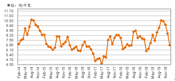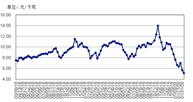 (1)毛雞價格跌至5元/千克左右。一方面,“新冠肺炎”疫情防控影響正常復工,屠宰場延遲開工,開工率不足50%。另一方面,部分養殖場由于飼料短缺,急于出欄;部分養殖場的肉雞已達出欄期限,被迫壓欄。由于毛雞供給數量遠遠大于當前屠宰數量,導致毛雞價格跌至5元/千克左右,部分地區跌破4元/千克,養殖場損失慘重。