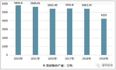 改革開放以來,隨著我國經濟的快速發展,人民生活水平的逐步提高,加之我國人口不斷增長,我國居民對于肉產品的需求了逐漸增大。隨著城鎮化水平的不斷提高,我國農村人口大量涌入城市,為我國豬養殖規模化發展提供了機遇,大量農戶散養殖退出。2014年,我國豬肉產量為5820.8萬噸,2019年,我國豬肉產量為4225萬噸。