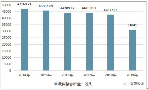 隨著我國環保政策的逐漸趨于嚴格,生豬養殖業的環保壓力逐漸增大,大量散戶養殖逐漸退出,降低了我國生豬市場的供給量。由于人們生活水平的提高,消費行為的逐步升級,我國豬肉產品的質量、口感等要求逐漸提高。2014年,我國豬存欄量為47160.21萬頭,2019年,我國豬存欄量降低為31041萬頭,整體呈現了降低的趨勢。
