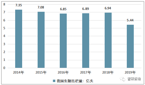 2014年,我國生豬出欄量為7.35億頭,2019年,我國生豬出欄量降低為5.44億頭,呈現下降趨勢。隨著我國對于生豬扶持政策的大力推出,我國養豬補欄增養的積極性顯著提升,生豬生產呈現明顯恢復勢頭,有力的保障了我國豬肉供應的穩定。