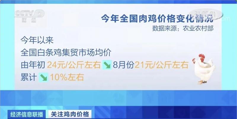 據農業農村部監測,今年以來,全國白條雞集貿市場均價,由年初每公斤24元左右降至8月份21元左右,累計下跌10%左右。9月份前兩周白條雞價格每公斤21.9元,同比下降幅度超過6%。