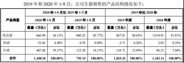 而在2020年1-9月,牧原股份仔豬銷售數(shù)量達(dá)467.8萬頭,占比高達(dá)39.37%,種豬銷售占比達(dá)4.49%。