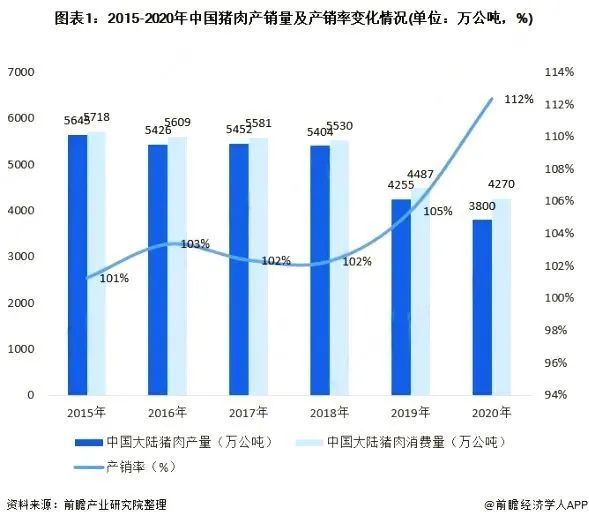 中國(guó)豬肉市場(chǎng)整體呈現(xiàn)供不應(yīng)求趨勢(shì),2019年中國(guó)豬肉產(chǎn)銷量均實(shí)現(xiàn)下降,2019年我國(guó)豬肉產(chǎn)量為4255萬(wàn)公噸,同比下降21%,2020年下降11%;銷量方面,2019年下降19%,2020年下降5%,小于產(chǎn)量降幅,從而導(dǎo)致我國(guó)豬肉產(chǎn)銷率上升至112%,增幅較大,我國(guó)豬肉市場(chǎng)整體供不應(yīng)求。