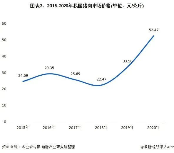 在豬肉市場(chǎng)供不應(yīng)求的局面下,我國(guó)豬肉價(jià)格自2018年持續(xù)上升,并且上升幅度較大,2020年我國(guó)豬肉平均價(jià)格達(dá)到52.47元/公斤,同比增長(zhǎng)56%,增幅提高7個(gè)百分點(diǎn)。
