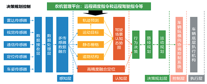 其次結合部署在邊緣云的核心控制系統及安裝在農機上的視覺、雷達終端,智能感知周圍環境;