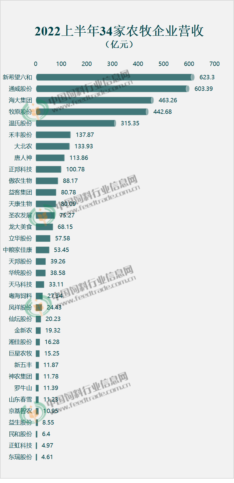 4、從飼料銷量看,只有新希望六和一家企業(yè)飼料銷量破千萬,上半年共銷售飼料1334萬噸。