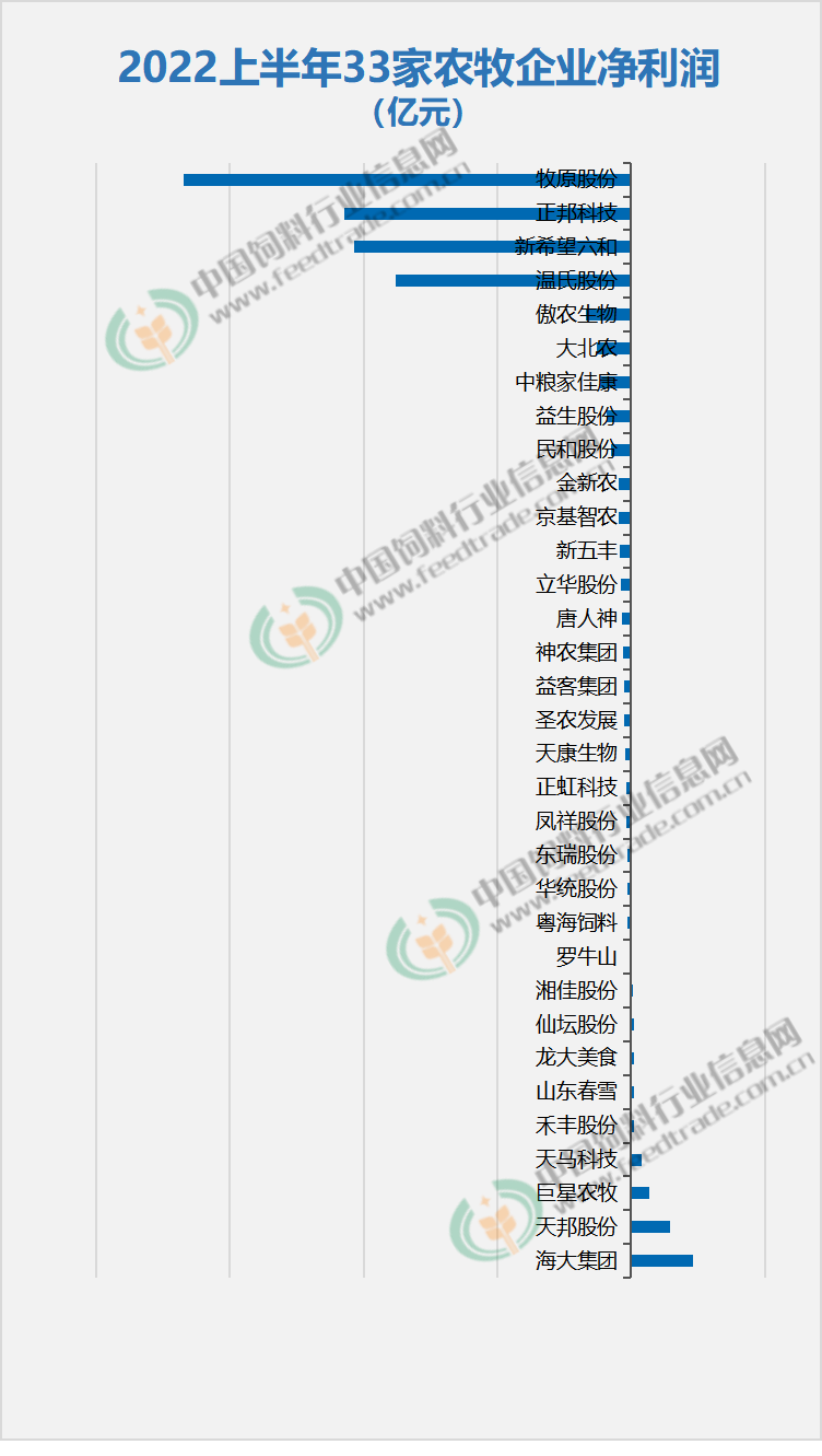 1、從凈利潤看,34家企業(yè)中盈利的企業(yè)只有10家,分別是通威集團(tuán),海大集團(tuán)、天邦股份、巨星農(nóng)牧、天馬科技、禾豐股份、山東春雪、龍大美食、仙壇股份和湘佳股份,合計盈利142.87億元,通威一家獨大,占85.6%。