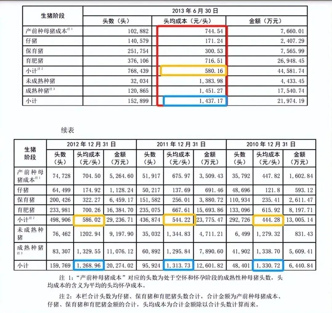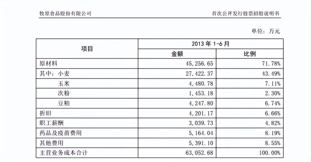 招股說明書中顯示2013年上半年,原材料成本占比72%,小麥、玉米、次粉、豆粕都是豬飼料的主要構成。其次還有折舊費用、養殖人員的工資、藥品及疫苗費用、其他費用。