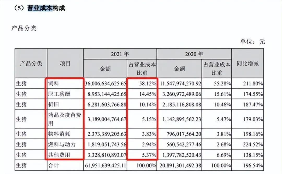 牧原的生豬養殖收入占總營業收入的比重超過95%,所以它的營業成本可以看作是全部與養殖業務相關產生的費用。