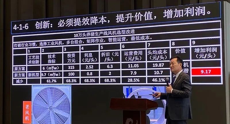 我們還要創新。我們還要對我們現有的傳統的產品進行優化。簡單的我這里找一個風機的案例給大家說,我們過去老風機是我們行業內用的風機。我說不行,為什么不用我們更新的更高效的風機,用這種小的風機。(看圖具體介紹性能和成本對比,此處略去。)所以創新不只限于我們的高科技,更對于我們所有的設備都要去思考。
