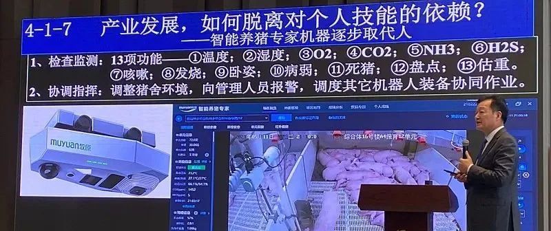 第四個話題,我們對人的技能依賴如何改進——一定靠智能化。這是我們那個現場巡檢機器人代替我們員工,它對豬舍的溫度、濕度、二氧化碳、氧氣、氨氣和氯化氫,和豬發燒咳嗦生病等,對這些都能夠去適應。他自動代替人,你哪個線沒看到,他會提醒你,如果你自己沒有處理說明你就沒關注,這邊就是上傳到后臺,后臺督導你去對這個豬群進行干預。就這樣看,相當于我們的一個優秀的飼養專家代替我們一個員工。我們培養一個優秀員工需要 3 年,好多員工 3 年不合格,需要 5 年甚至 10 年。但是我們要做臺機器在流水線,把我們所有養豬的智慧都集中起來了。這個我們現在生產出來很快,一天生產幾千臺,就是相當于生產了對應的勞動力個數。