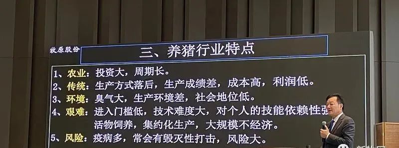 最后,還有一個(特點)就是風險大,疫病多,常常會有毀滅性打擊。一般是如果一個廠在豬價很低的時候,如果一發病基本上是破產,因為豬死光了的話,剩下的場空坑,轉不起來了。這就是我們行業的五大特點。那么我站在這個行業外,看我們行業發展,看我自己發展。那我們就應該拿這五大特點作為我們的這個創新的發力點。