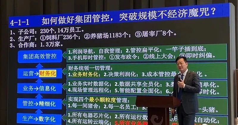 那么這樣管控是什么概念呢?就是過去我們養豬,蒙著頭養,一年之后都不知道成績怎么樣,只有老板知道,我今天賺了虧了,也是個大概。像這樣一個非工業標準計件的,上下成本摻和,很難算清賬的在這里一下把賬算清楚了。第二個就是我成績馬上知道。好,回到我們這里去管人,(大意是有了問題可以直接找到對應負責人)。管物是另外一個平臺,我就不管了,采購銷售物資那個我不管,我重點抓技術抓人這兩件大事啊——人都管得少,我重點抓的是關鍵技術,帶領大家做豬的技術研發。