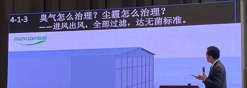 然后我們現在說這個臭氣怎么治理,我們現在用這套系統,把這個養豬生產全部升級了,我們是進出風的,全過濾,到了無菌標準。(依據視頻介紹空氣過濾系統,略過。)如果沒有這個東西,牧原全國 24 個省發展,在現在這種環保要求條件下,和農民生活質量不斷提升,民眾環保意識提升,這個背景下發展不起來。