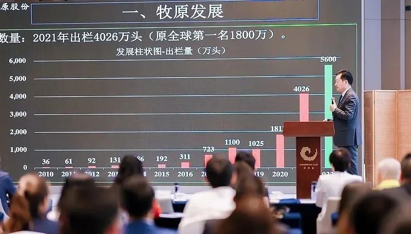 經過了這 30 年的發展,我們現在的出欄量每年都是一個近乎 50% 以上的增長,特別是到了2019年一千萬頭,在2019年發生非洲豬瘟的這個情況下,(2020年)到 1800萬頭,這個已經到了世界第一了。那么到去年達到了 4000 萬,反而是在非瘟之下增長這個勢頭沒有減弱。那么2022年能達到 5600萬頭左右,未來發展還有一個比較好的勢頭。另外我們的發展不是當年留下來的,都是幾年前準備的,到目前只是一個表達而已。