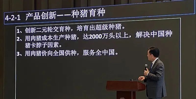 我們第二個創新層面是產品創新。我們用這個輪回雜交豬培養超級種豬,解決了我們國家全國用種的問題。我們(聽不清)提出來說卡脖子的因素有哪些,不要被卡住。實際上我們打通了這個瓶頸,我們用肉豬價格向全國提供種豬。牧原的這個種豬生產方式,在很快就會重新的改變我們全球供種的這個模式,像牧原用肉豬賣種豬的這個方式不得了。