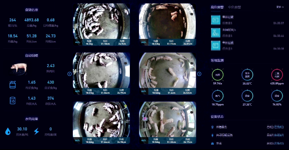 通過攝影儀將每個欄位的豬只影像實時上傳到后臺智慧運算服務器,采用智能估重算法,對數據進行內容分析和數據對照,結合AI攝像機采集的豬只影像,智能化分析豬只的平均體長體寬,根據豬只的體重密度預估出平均體重,準確率高達95%。