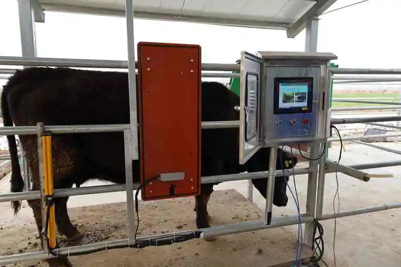 Δ河南省鼎元種牛育種有限公司核心育種場工作人員正在使用肉牛線性鑒定系統測定牛只體型數據。