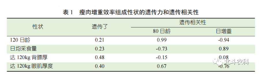 加裕公司自2004年開始記錄個體的飼料攝入量、生長速度和超聲波測量脂肪和眼肌厚度。對體重在80kg和120kg左右的個體豬進行了超聲波背膘和眼肌厚度的采集。這些信息使我們能夠估計瘦肉增重效率的組成性狀之間的遺傳力和相關性,這些性狀包括70-120kg期間的日均采食量(ADFI)、達120kg日齡、120kg體重時的背膘厚(FD120)和眼肌厚(LD120)。為了更好地了解不同生長階段的效率,我們估計了瘦肉增重組成性狀和達80kg日齡與80-120kg平均日增重之間的遺傳相關性(表1)。經過對120日齡篩選的長期關注,加裕種豬獲得了非常好的快速生長的遺傳潛力。