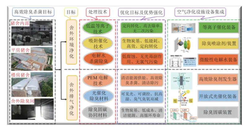 豬舍空氣凈化技術主要分為物理法、化學法和組合法。物理法主要包括濾網過濾、通風、紫外線輻射消毒、等離子體消毒等,化學法主要包括光催化消毒、過氧乙酸、二氧化氯和臭氧等,組合法指的是物理與化學方法的結合。