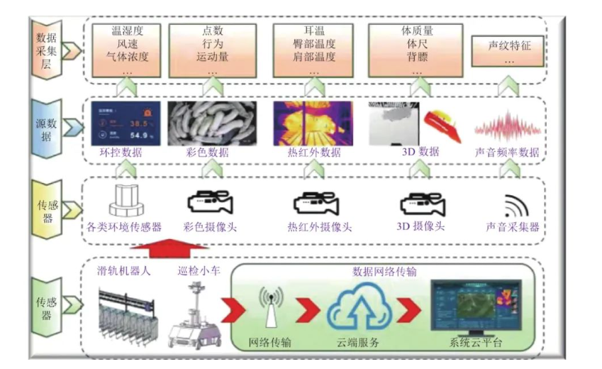 其次,引進前沿的人工智能等技術。豬臉識別技術、健康感知技術等在規?;i場得到了部分應用,取得了較好的效果,但是普及率很低,還需要大范圍的推廣應用,實現生豬生理生長及健康行為的無應激感知,實現對豬群個體或群體主要體征指標的無應激估測,基于機器視覺及深度學習技術實現對非洲豬瘟、藍耳病等生豬主要傳染病的監測預警。