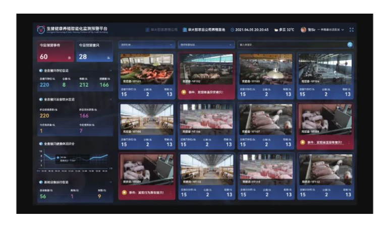 豬只生長及健康狀態信息智能感知技術是智能化養殖過程的核心技術。能有效提高動物福利,更符合綠色高效智能養豬工廠的發展需要。豬只生長及健康狀態感知技術,通過搭載溫濕度、光照、二氧化碳含量、氨氣含量等傳感器實時監測豬場環境參數,通過搭載熱紅外成像傳感器實時監測豬只體溫,通過搭載2D/3D攝像頭及聲音采集器實時監測豬只行為,實現豬只點數、豬只體征信息采集等。生豬健康養殖智能化監測預警平臺,實時顯示養殖基地內生豬養殖信息,具體信息包括豬只存欄、豬只采食飲水情況、豬只健康體況評分等,用戶可以查看今日預警豬只和今日預警事件,對異常狀態進行及時處理。
