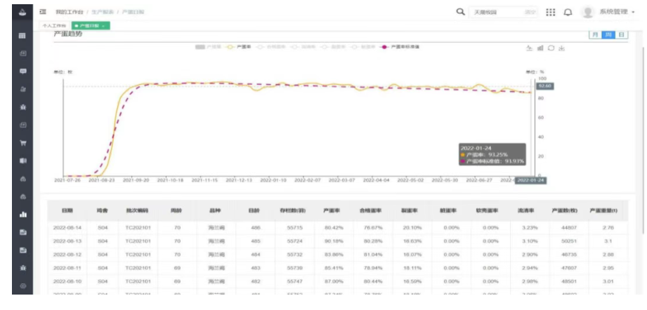 通過LORA/NB-IOT技術構建的雞舍物聯網環境監控系統(圖1)和集成傳感器的巡舍機器人,實現對蛋雞生長環境和生理狀況的全方位的監測。再結合生產過程信息化管理系統(圖2),實時對雞舍內的環境溫度、濕度、CO2、產蛋率、飲水率、飼喂量等蛋雞養殖信息的采集、存儲與分析,實現對雞舍環控終端設備的智能動態聯動控制,動態化調控構建蛋雞生長的適宜環境。