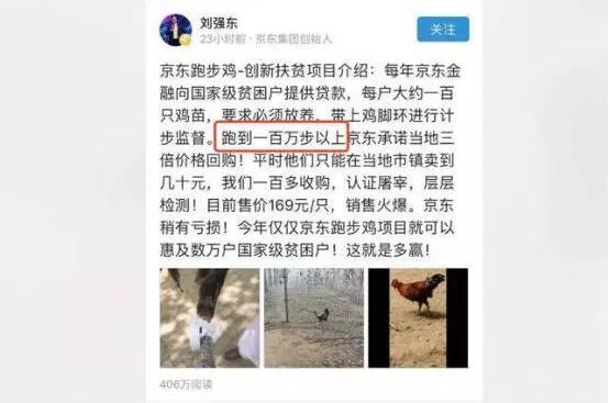 2017年5月25日,劉強東在今日頭條上曬出了京東跑步雞的扶貧項目介紹,文內(nèi)提到,京東養(yǎng)的跑步雞要求必須放養(yǎng),并且每只雞的腳上都有計步器監(jiān)督,只有跑夠一百萬步以上京東才會以一百多的超高價格收購。每一只雞需要一百萬步才達標(biāo),168元/只回收。