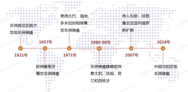 該病毒最早于1921年在非洲東部肯尼亞首次被發(fā)現(xiàn),隨后開始在撒哈拉以南的非洲東部、中部、南部等地區(qū)蔓延。1957年病毒從非洲的安哥拉傳到歐洲的西班牙,病毒開始在歐洲呈零星、持續(xù)流行。1971年病毒從西班牙傳人南美洲的古巴,南美洲和拉丁美洲的多數(shù)國家陸續(xù)暴發(fā)疫情。2007年病毒傳入歐亞接壤的高加索地區(qū),隨后開始向俄羅斯南部地區(qū)擴(kuò)散流行。2017年,俄羅斯遠(yuǎn)東地區(qū)爆發(fā)非洲豬瘟,ASFV完成了從非洲到歐洲、美洲再到亞洲的傳播態(tài)勢(shì),傳人中國似乎只是遲早的事情。