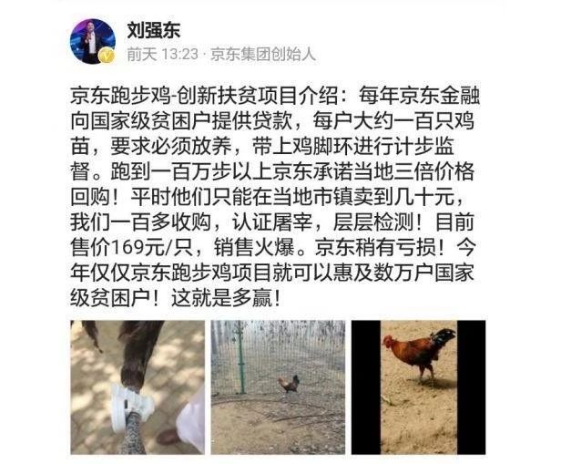 2017年5月份,京東創(chuàng)始人劉強(qiáng)東在微博上曬出京東跑步雞的扶貧項(xiàng)目介紹。這是京東切入養(yǎng)殖的第一個項(xiàng)目。