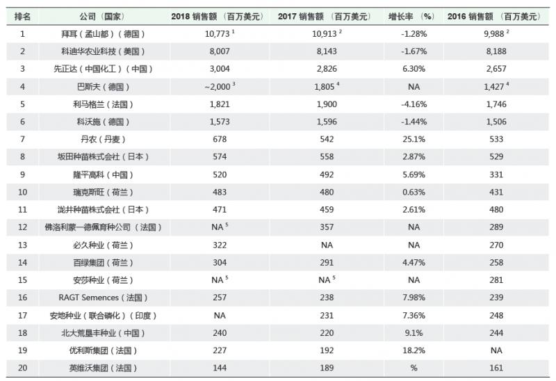 5. 佛洛利蒙一德佩育種公司,安莎種業無可利用的2018 年銷售額數據,排名暫按照2017 年或2016 年的數據;