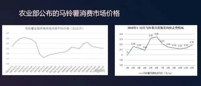 我想說的就是這個邏輯,同等金額的貨幣,購買力下降了很多。小麥的最低收購價,我們也追溯到十年前,2009年,小麥的收購價是0.9元/斤,現在1.2元/斤,也是大約30%的增長。玉米十年前收購價是0.76元/斤,現在1元/斤。馬鈴薯從2016-2019年的數據顯示,2016年底馬鈴薯還處于高位,2017年馬鈴薯價格一直跌倒了谷底,我記得2018年2月我們的馬鈴薯大會的主題就是《活下來,經“贏”你的農場》。