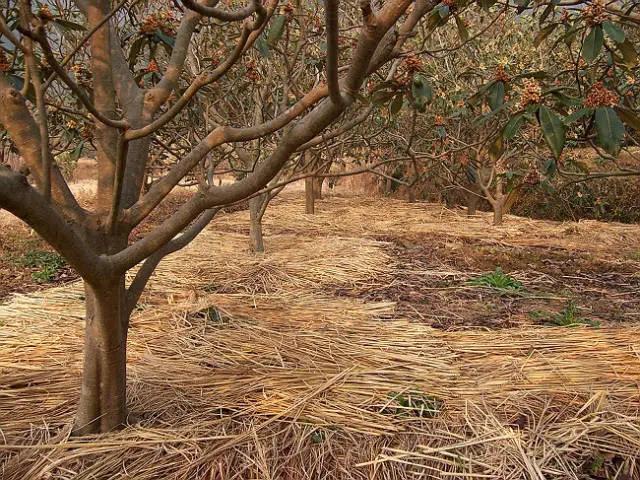 果園覆草即是將農作物秸稈、果園內雜草、果樹的枯枝落葉等作為覆蓋材料,通過這些材料腐爛是增加果園土壤有機質的一種常用辦法。雜草枯葉與枯根、刈割的牧草等經深翻后主要分布在0~20 厘米土層中,在土壤中降解、轉化,形成腐殖質,可使土壤中有機質含量提高。研究表明,連續 3 年樹盤覆草后,0~20 厘米土壤有機質含量比“清耕”園提高 0.38 個百分點。蘋果園覆蓋麥草  5 年后,0~20 厘米 土壤有機質含量由 0.85% 提高到 1.18%,20~40厘米土壤有機質由 0.43% 提高到 0.52%。葡萄園覆蓋麥草3年后,0~20 厘米土壤由 0.92%提高到 1.25%,20~40厘米土壤由 0.5% 提高到 0.6%。