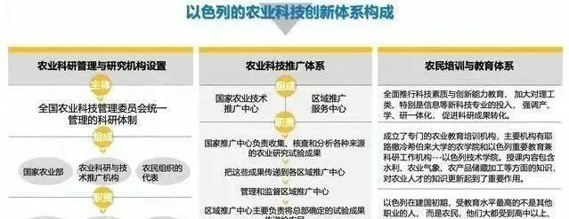 以色列非常重視農業新品種研發,每十年都要推出5個新品種;二是注重生產裝備研發,以色列是設施農業發達的國家之一,以色列設施農業包括種植、畜禽養殖、水產品養殖及農產品采收機械、、溫室智能農機、農產品加工機械、保鮮設施等。每三年的以色列農業國際博覽會就是國際農業裝備展覽會。
