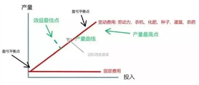 這張圖搞經(jīng)濟(jì)的人一看就明白,但許多做農(nóng)業(yè)的人理解不了。做農(nóng)業(yè)的人一直要追求產(chǎn)量高,而做經(jīng)濟(jì)的人則想要效益最大化。隨著生產(chǎn)投入的增加,農(nóng)作物的產(chǎn)量就會(huì)增加。但是超出了最佳的投入產(chǎn)出的效益點(diǎn),再增產(chǎn)意味著投入產(chǎn)出比的下降,是與經(jīng)濟(jì)的規(guī)律背道而馳的。