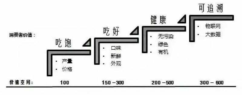 我們從下面一張圖可以看到,以消費(fèi)者的立場(chǎng)出發(fā),價(jià)值去向有四個(gè)階段,一是吃飽,二是吃好,三是健康,四是可追溯。