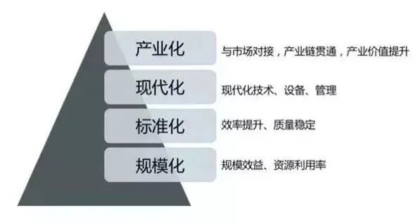 即從規(guī)模導(dǎo)向轉(zhuǎn)化為產(chǎn)業(yè)化的導(dǎo)向。在這里要明確產(chǎn)業(yè)化的定義和實(shí)現(xiàn)路徑。產(chǎn)業(yè)化實(shí)現(xiàn)是需要經(jīng)過(guò)四個(gè)階段:一是規(guī)模化,二是標(biāo)準(zhǔn)化,三是現(xiàn)代化,四是產(chǎn)業(yè)化。規(guī)模化是要達(dá)成基本的規(guī)模效益;然后實(shí)現(xiàn)每一個(gè)環(huán)節(jié)的標(biāo)準(zhǔn)化操作,一個(gè)是提升效率,二是產(chǎn)品的質(zhì)量保持一致;做完了標(biāo)準(zhǔn)化以后,才能夠?qū)崿F(xiàn)現(xiàn)代化,通過(guò)現(xiàn)代化技術(shù)、設(shè)備、管理來(lái)提升它的效率;在現(xiàn)代化的基礎(chǔ)上才能夠?qū)崿F(xiàn)產(chǎn)業(yè)化。