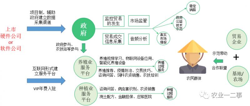 在上圖中的起點(diǎn)是期待進(jìn)入農(nóng)業(yè)行業(yè)耕耘的上市硬件公司或者軟件公司。上市企業(yè)并不是硬指標(biāo),主要是擁有良好的企業(yè)形象和資金支持,并能夠撬動(dòng)政府資源,以政府的角度出發(fā),基于政府的角度,構(gòu)建服務(wù)農(nóng)民幫助農(nóng)民的體系。