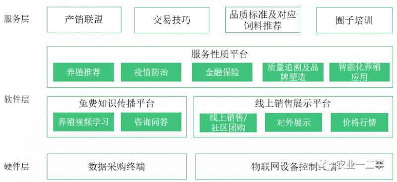 在養(yǎng)殖業(yè)服務(wù)平臺(tái)上,能夠?yàn)轲B(yǎng)殖戶提供軟件層面如養(yǎng)殖視頻學(xué)習(xí)、咨詢問答,智能化養(yǎng)殖應(yīng)用、養(yǎng)殖推薦、疫情防治;硬件層面的物聯(lián)網(wǎng)設(shè)備;服務(wù)層面的圈子培訓(xùn)、交易技巧、農(nóng)技培訓(xùn)等。具體如下圖所示。