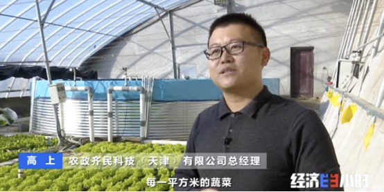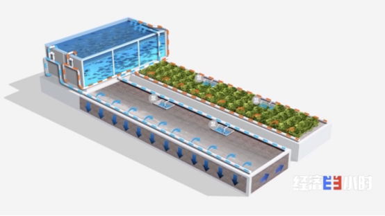 它比傳統魚塘里養魚節水90%,比普通蔬菜大棚節約土地80%。可以做到傳統農業種植蔬菜5倍的產能,傳統養殖10倍的產能。