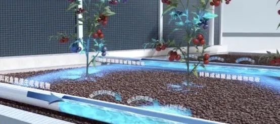 魚吃飽喝足,排出糞便后,魚池的排水管道將含有糞便的污水,排到旁邊種菜的鵝卵石種植床上。在蚯蚓和周邊天然真菌的作用下,分解出的營養成分,最終被蔬菜吸收。