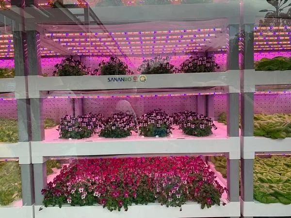 據(jù)李紹華介紹,中科三安泉州基地已建成了幾棟一萬平方米的植物工廠,每層3000多平方米,有三層。他還指著路旁一個里面裝著燈、種著花的集裝箱說,“這是集裝箱改造的植物工廠,我們只采花,一般兩毛錢一朵,供給餐廳做菜上裝飾,是可以食用的三色堇,一天要采很多,采了又長。”