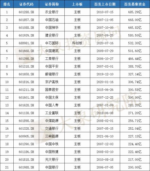 從歷年募資額來看,2010年7月,A股上市的農業銀行,首發募資685億元,創出迄今為止A股史上最大金額IPO,此后500億以上的IPO就是2020年7月上市的芯片巨頭中芯國際,募資532億元。