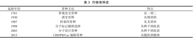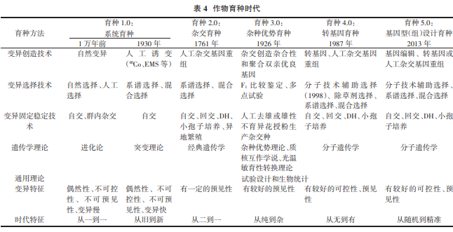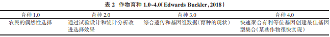 國際種子聯盟秘書長邁克爾·凱勒2017年在 《亞洲種子》雜志上提出的"作物育種創新"討論,總結了作物育種的里程碑事件。1年以后,美國康奈爾大學玉米遺傳育種學家、美國科學院院士BUCKLER教授,在2018年初提出了"育種4.0"的理念,即作物育種技術的發展伴隨人類社會的進步已經歷了3個標志性階段,目前正跨入第4個階段(如表2)。美國科學院院士、北京大學教授鄧興旺2018年在不同的研討會上也討論了作物育種史(表3)。作者在2018年發表《揭秘水稻育種發展的"基因"(5)一一結束語》中,也談及育種過程歷史,主要觀點如表4。